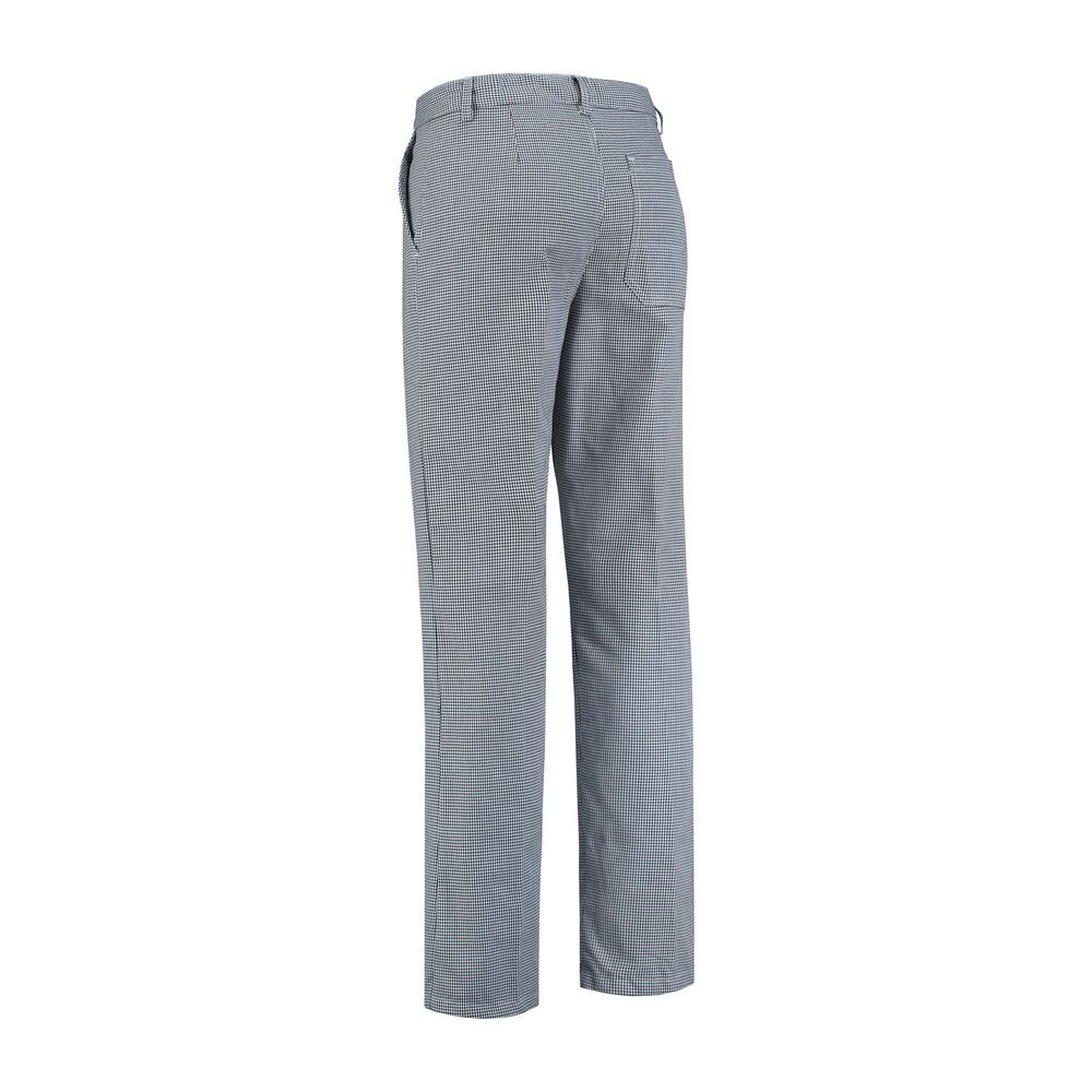 Bakkersbroek 65% polyester / 35% katoen, 200 gr./m2. Knoopsluiting met rits, 2 zijzakken, 1 achterzak, riemlussen, verstelbaar elastiek in de tailleband.