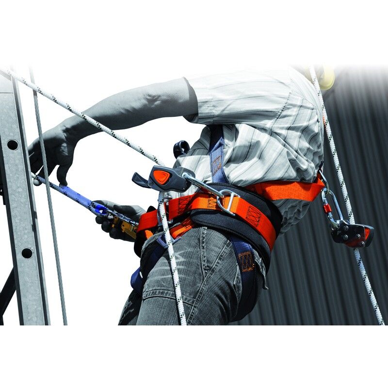 Glijdende valbeveiliger met energieabsorbeerder die de bewegingen van de gebruiker vergemakkelijkt