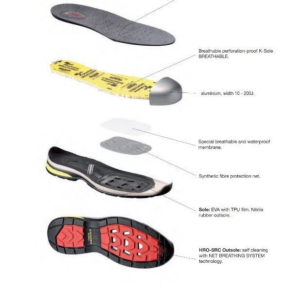De Diadora Glove Tech Hi Pro veiligheidsschoenen zijn uniek in zijn soort. Bijzonder is het Net Breathing System gepatenteerd door GEOX. Deze technologie zorgt ervoor dat vocht geabsorbeerd wordt en via miniscule gaatjes in de zool direct wordt afgevoerd. Tegelijk kan water de zool niet binnendringen, omdat de watermoleculen simpelweg te groot zijn. Uw voeten blijven met deze schoenen dus veel langer droog en fris en dat maakt de werkschoenen daardoor erg comfortabel om te dragen met goede temperatuurregeling. De loopzool is gemaakt van rubber en biedt een SRA genormeerde slipweerstand. De zool is olie- en zuurbestendig en bestand tegen kortstondige contactwarmte, tot 300 graden celsius. Veiligheid wordt verder gegarandeerd door de K-Sole kevlar veiligheidszool zodat scherpe materialen en voorwerpen de zool minder snel kunnen binnendringen. Deze zool is licht van gewicht en extra ademend en flexibel. Dat geldt ook voor de EVA tussenzool die aan de buitenzijde voorzien is van een slijtvaste TPU laag. De ademende en verwisselbare inlegzool biedt verder een goed comfort. De upper van deze Diadora veiligheidsschoenen is gemaakt van echt Italiaans Perwanger leer. Dit leer is ademend en ook vuil- en waterafstotend. De slijtvaste upper gaat ook langer mee. Vooraan is de veiligheidsneus gemaakt van aluminium met een PU laag over de neus zodat de kans op slijtage verkleind wordt. Ook zit er een TPU laag op de hiel. In de hiel zit ook speciale energieabsorptie verwerkt. De stevige polstering voorkomt dat u vaak uit de schoenen slipt. De binnenvoering is voorzien van ademende Air Mesh technologie. De ESD norm geeft aan dat elektrostatische ladingen via de zool snel naar de grond worden afgevoerd.