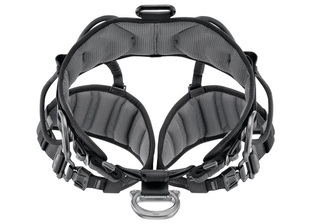 Zitharnas dat kan worden omgezet in een volledig lichaamsharnas voor valbeveiliging door een TOP of TOP CROLL borstharnas te verbinden met een RING OPEN of een snelsluiting