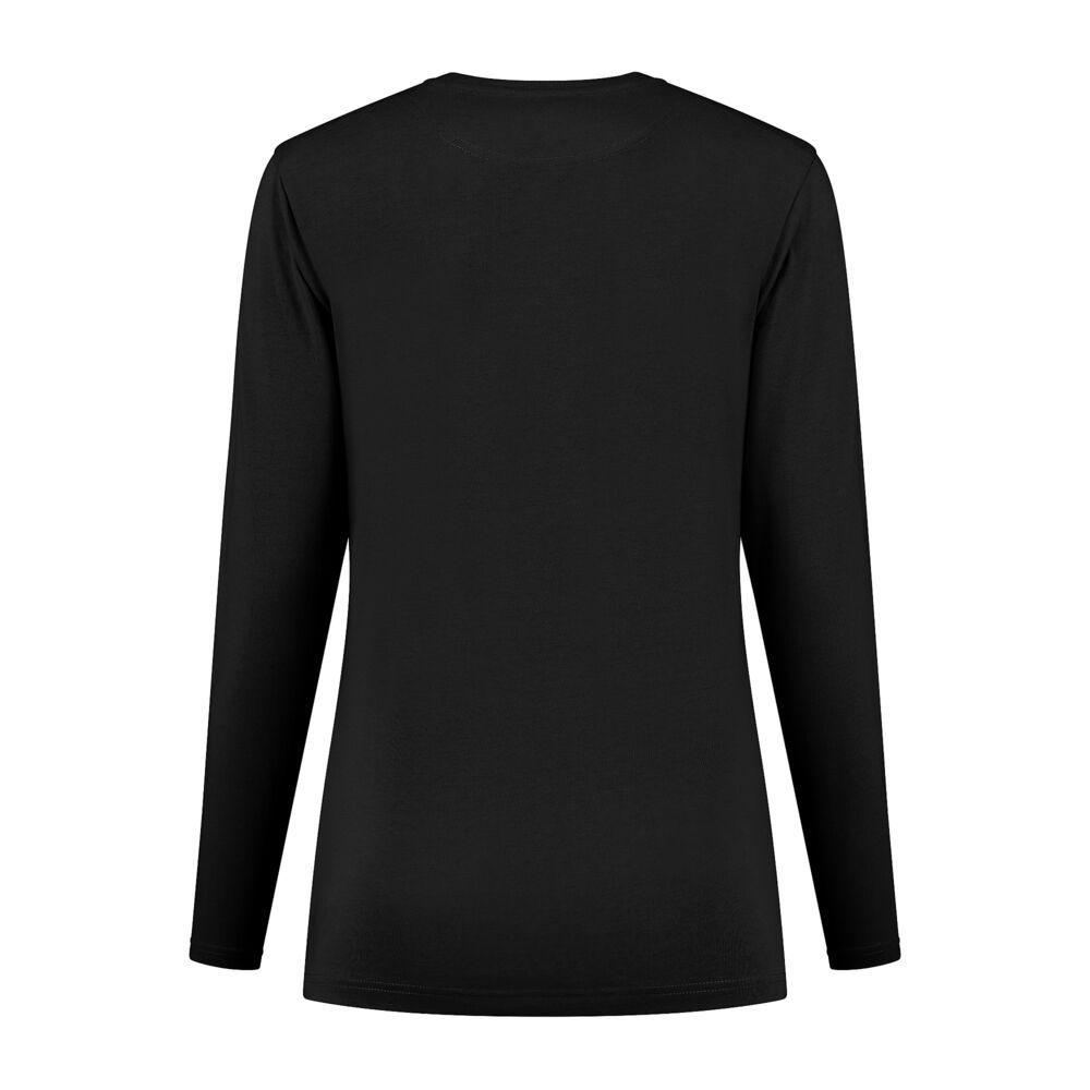 T-shirt met lange mouw, 50% gekamd katoen / 50% polyester, 180 gr/m², single jersey, ladies fit met schouders voorzien van een dubbele laag stof voor extra versteviging en halve maan, V-hals met 1x1 ribboord en antibacteriële afwerking. (Sport grey is melange: 85% gekamd katoen / 15% viscose).