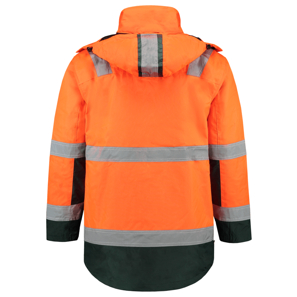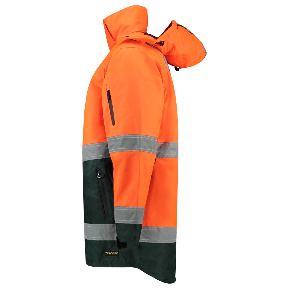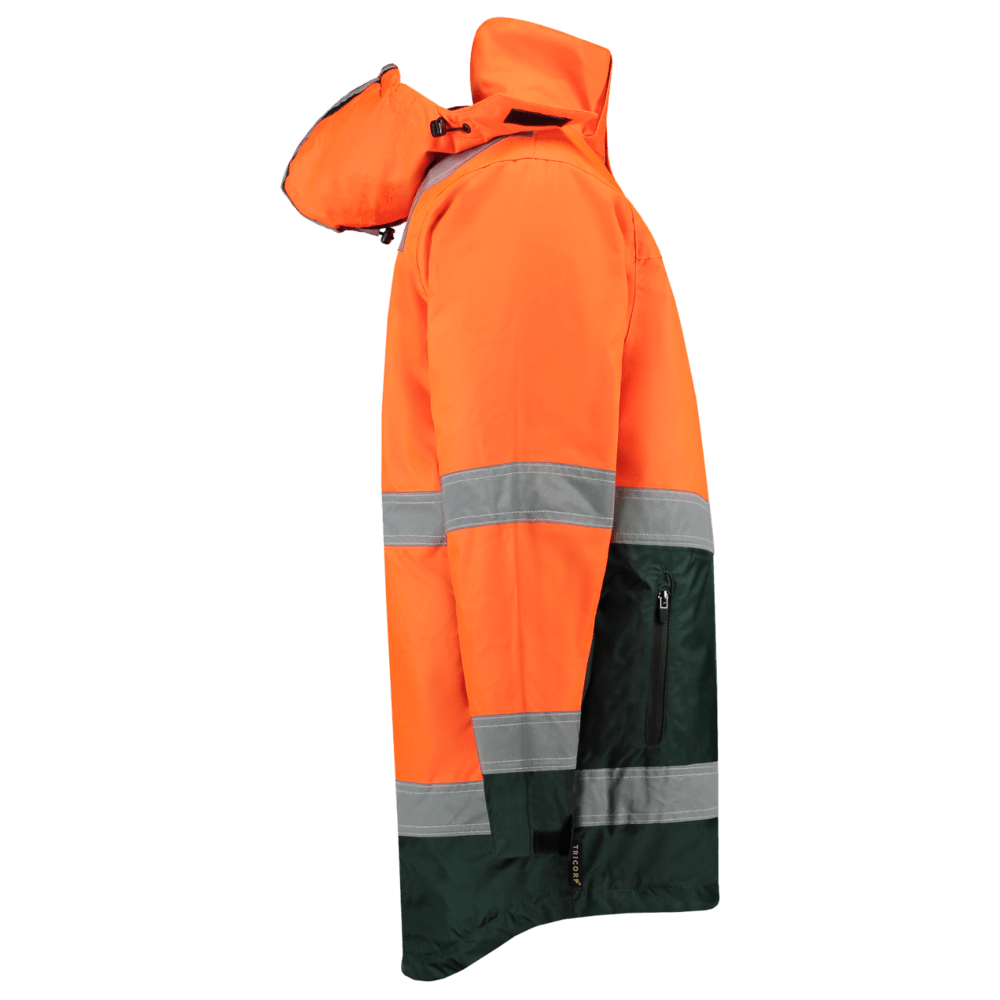Deze tweekleurige High Visibility parka van het label Tricorp Safety is gemaakt van een sterke kwaliteit fluordoek en contrastdoek met een PU-coating. Wind-, waterdicht en ademend conform EN343 klasse 3:3. Voorzien van getapete naden en gelamineerde waterafstotende ritsen. Hoge zichtbaarheid conform EN ISO 20471:2013, Klasse 2. De parka heeft een afritsbare capuchon, steekzakken met een rits afsluitbaar, een binnenzak met rits geschikt voor een telefoon. Tevens voorzien van baardkapje, verlengd rugpand, printerrits, dubbele stormflap met waterkering en een verdekte drukknoopsluiting. Deze parka heeft een comfortabel uitneembaar thermo binnenjack dat separaat draagbaar is maar niet als werkjas te gebruiken.