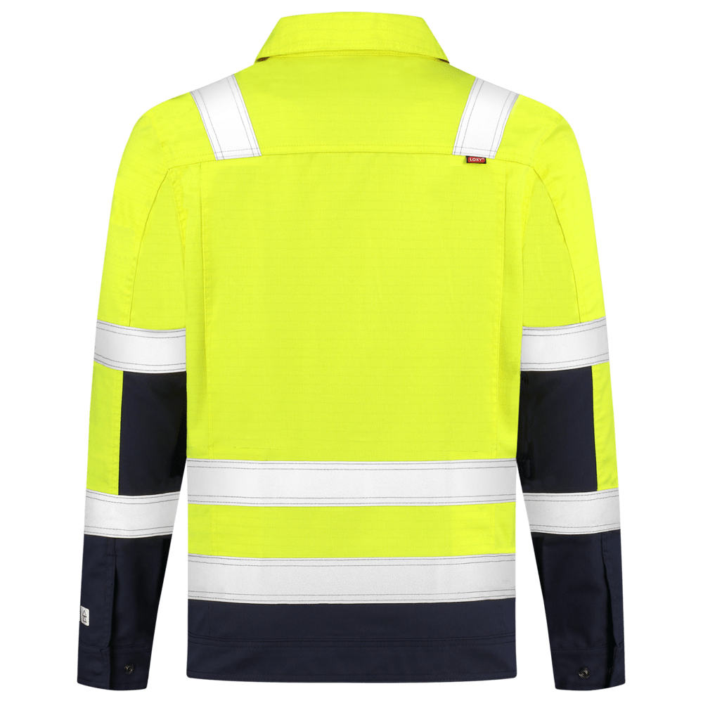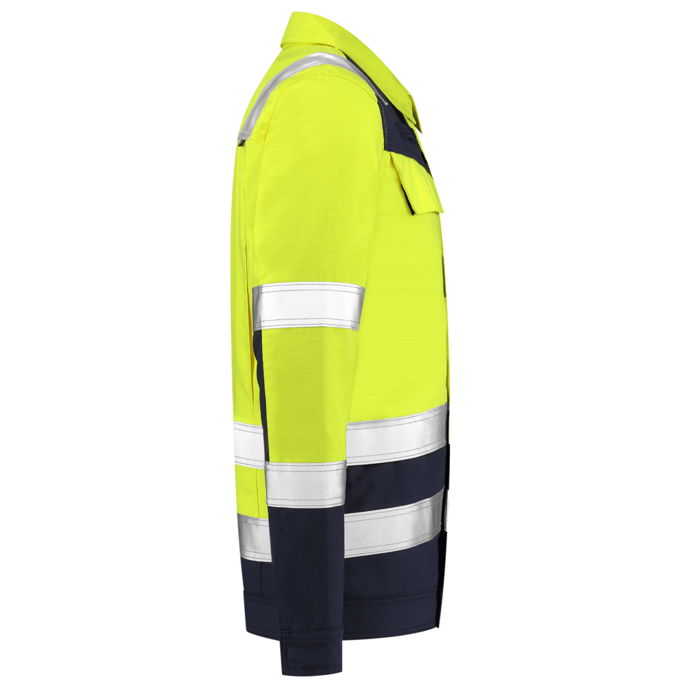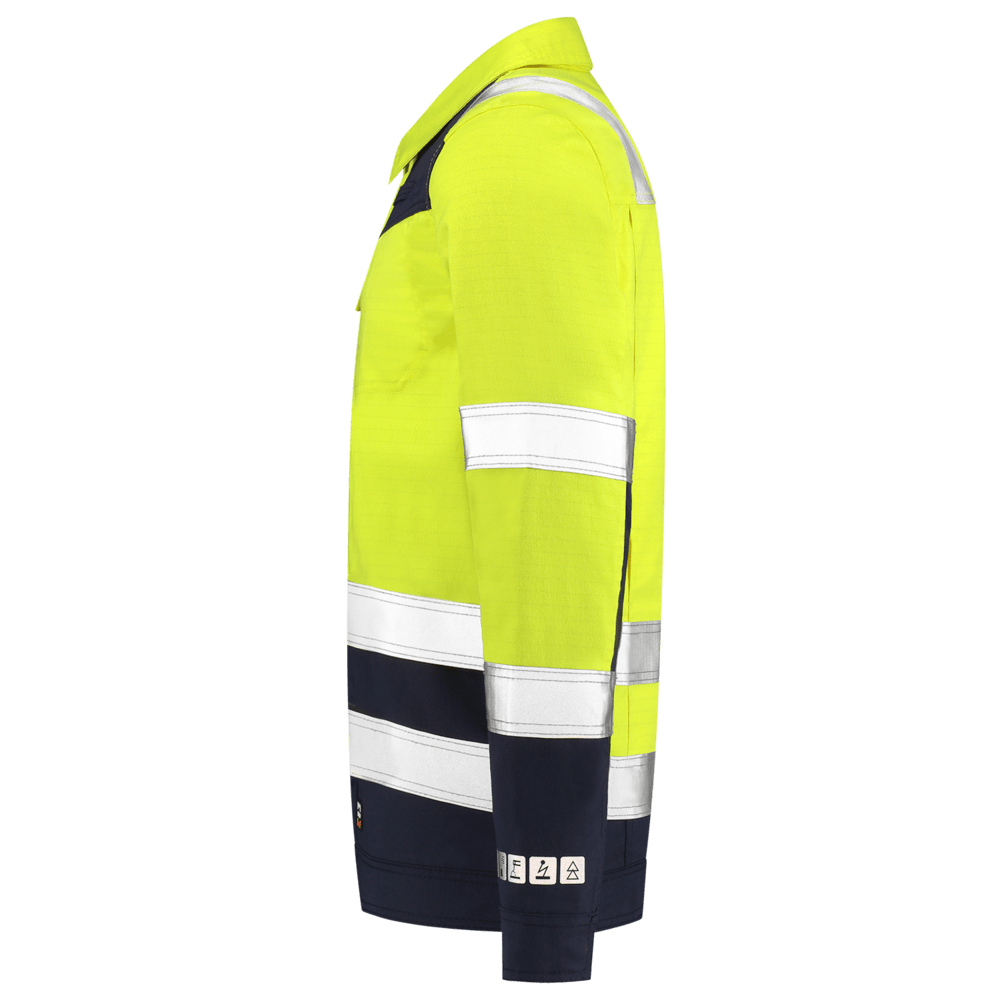 Beschermende kleding is verplicht wanneer er op de werkvloer gevaarlijke situaties kunnen ontstaan. Multinorm kleding biedt uitkomst wanneer u beschermd moet worden tegen meerdere risico's. Deze multinorm werkjas heeft een regular fit en is vervaardigd uit 74% katoen, 25% polyester en 1% uit andere vezels. Door de twill weving is deze jas erg sterk. De jas biedt bescherming tegen hitte en vlammen (EN ISO 14116:2015), vloeibare chemicalien (EN13034:2005 + A1:2009), spatten van las- en aanverwante werkzaamheden (EN11611:2015) en thermische gevaren van een elektrische vlamboog (IEC 61482-2). Tevens is de werkjas EN 1149-5:2018 gecertificeerd. Het product voorkomt daardoor het ontstaan van vonken die explosies kunnen veroorzaken. De bicolor werkjas is EN ISO 20471 gecertificeerd, waardoor de drager in gevaarlijke situaties (zowel bij dag, schemer als nacht) meer opvalt. Deze jas is toegevoegd aan het assortiment voor professionals die veelal binnen werken. De multinorm jas heeft een ergonomische pasvorm en een prettig draagcomfort. Combineer deze jas met onze multinorm werkbroek voor een moderne look met een dynamische belijning. De multifunctionele zakken zorgen voor voldoende opbermogelijkheden. Bovendien is dit artikel industrieel wasbaar t/m 75 graden celsius volgens de norm EN ISO 15797.