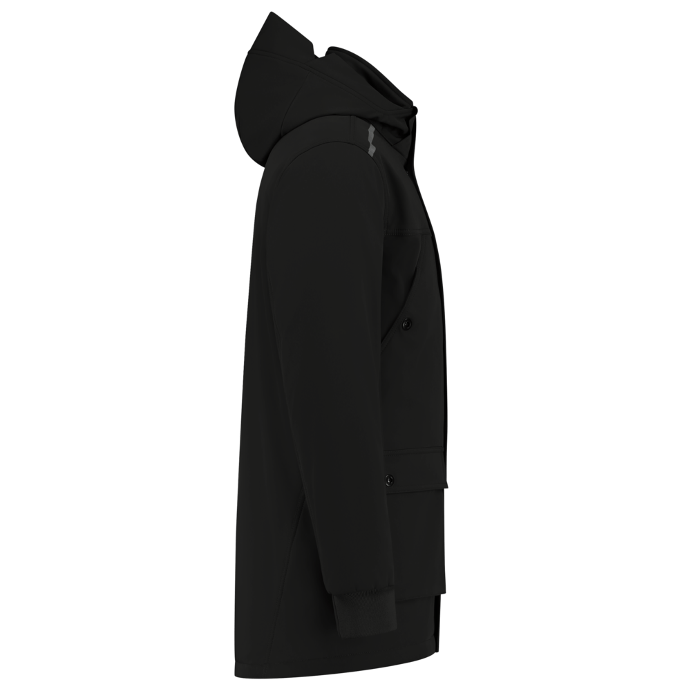 De naam ‘parka’ geeft het model van de jas al aan: de jas valt namelijk tot over de heupen. Dit geeft een zeer casual en moderne uitstraling. De borstzakken hebben een schuine opening en zijn afsluitbaar met een drukker. Ideaal om je handen in te steken zodat ze lekker warm blijven! Er zijn voldoende zakken aanwezig om al jouw handige work tools in op te bergen: zakken op het voorpand met intast aan de boven- en zijkant, twee binnenzakken en twee borstzakken afsluitbaar met drukkers. De ritssluiting is bedekt met een stormflap die afsluitbaar is met verdekte drukkers. De capuchon heeft een uitsparing aan de zijkant voor extra zicht en is volledig afneembaar middels drukkers. Om extra zichtbaar te zijn in het donker, is er op de schouders, de capuchon en op het achterpand een reflecterende print toegevoegd. Er is ook een printerrits aanwezig zodat je de jas eenvoudig kunt bedrukken.