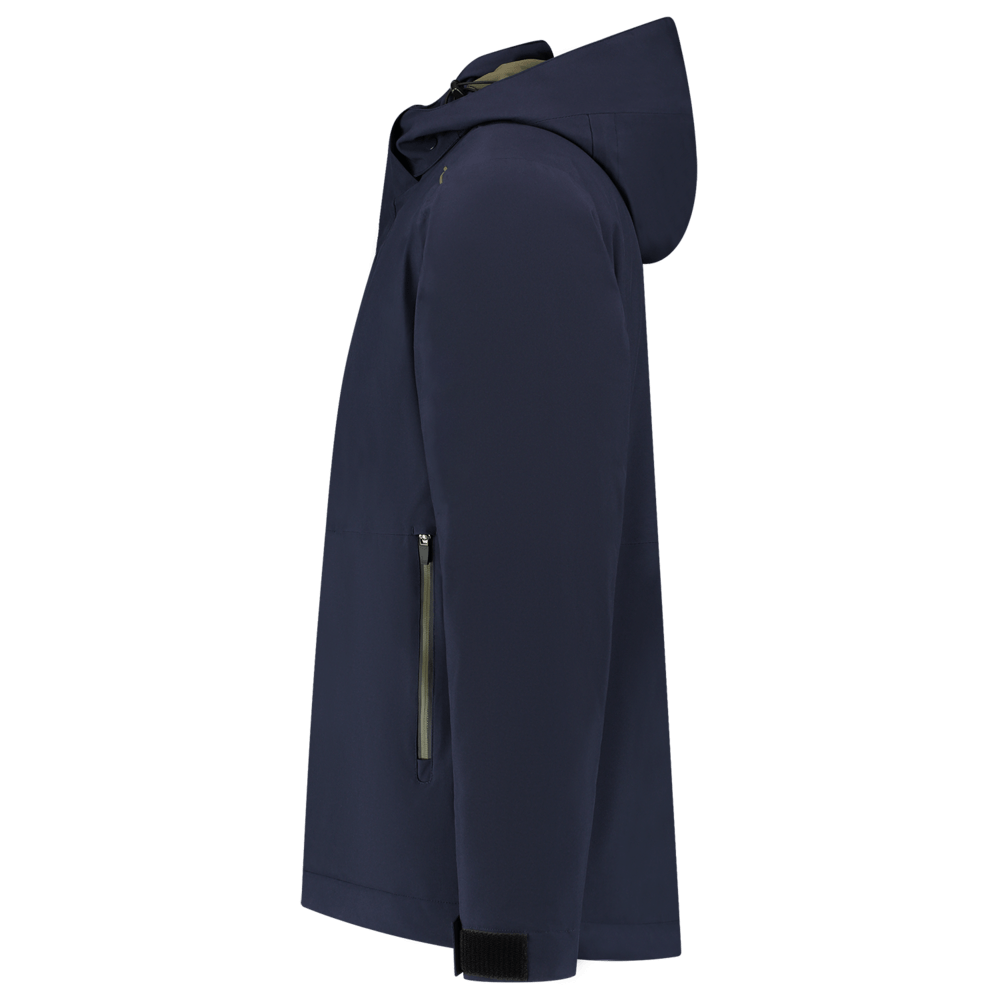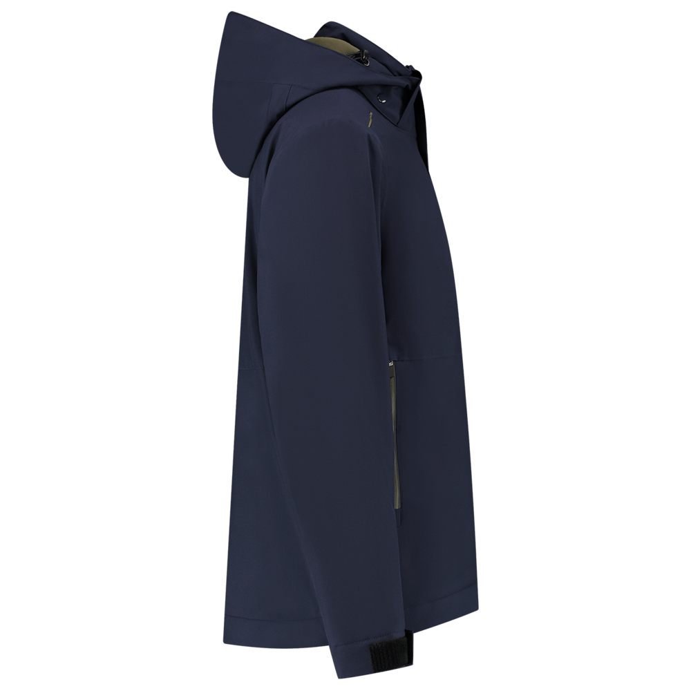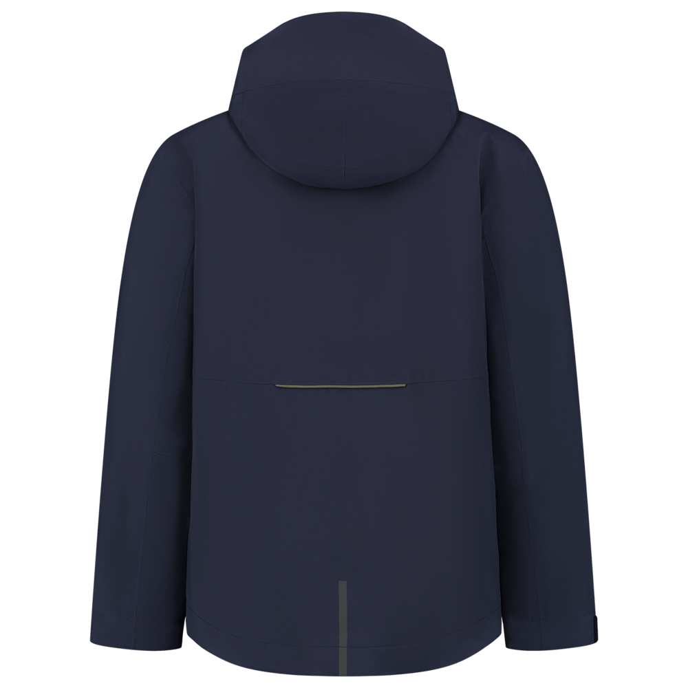De Winter Tech Shell Accent is voorzien van een printerrits aan de onderkant van het achterpand. De schouderpartij en zoom hebben een verstevigd contrastdoek. De jas heeft een tweede rits in de hals voor een verstelbare halsopening, voor wanneer de professional een sjaal of col wil dragen. De capuchon is afneembaar en heeft verdekte koordstoppers. Er is gebruik gemaakt van hoogwaardige materialen zoals een YKK-ritssluiting en een tricot manchet met duimopening. Onder de armen zitten verdekte ventilatieritsen voor extra comfort en voor een hoger ademend vermogen. Door het koord aan de onderzijde is de jas naar wens te verstellen.