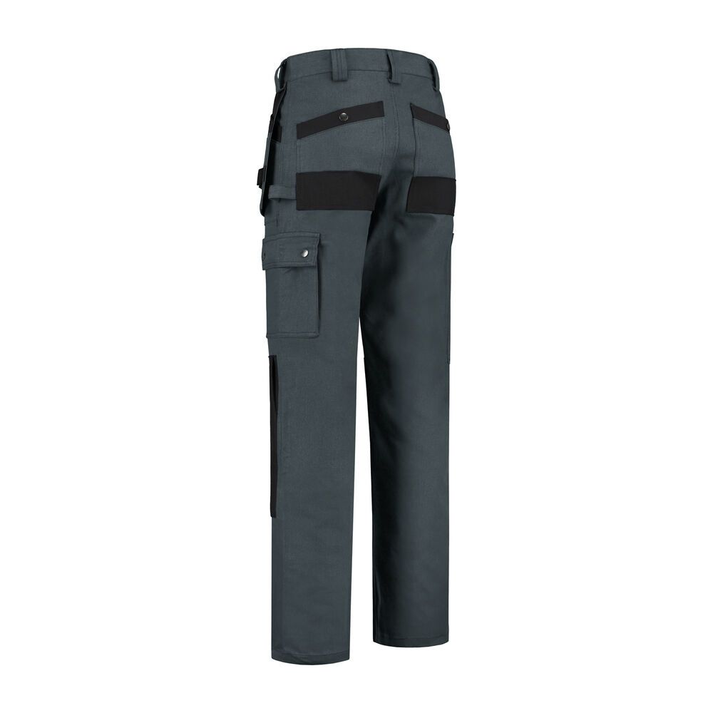 Werkbroek 100% katoen, 350 gram/m2, 2 zijzakken, 2 loshangende voorzakken, 2 acherzakken met drukknoopsluiting, YKK ritssluiting, dijbeenzak met drukknoopsluiting, duimstokzak, cordura kniezakken, cordura afwerkingen, hamer lus, naden binnenbeen en kruis drievoudig gestikt.
